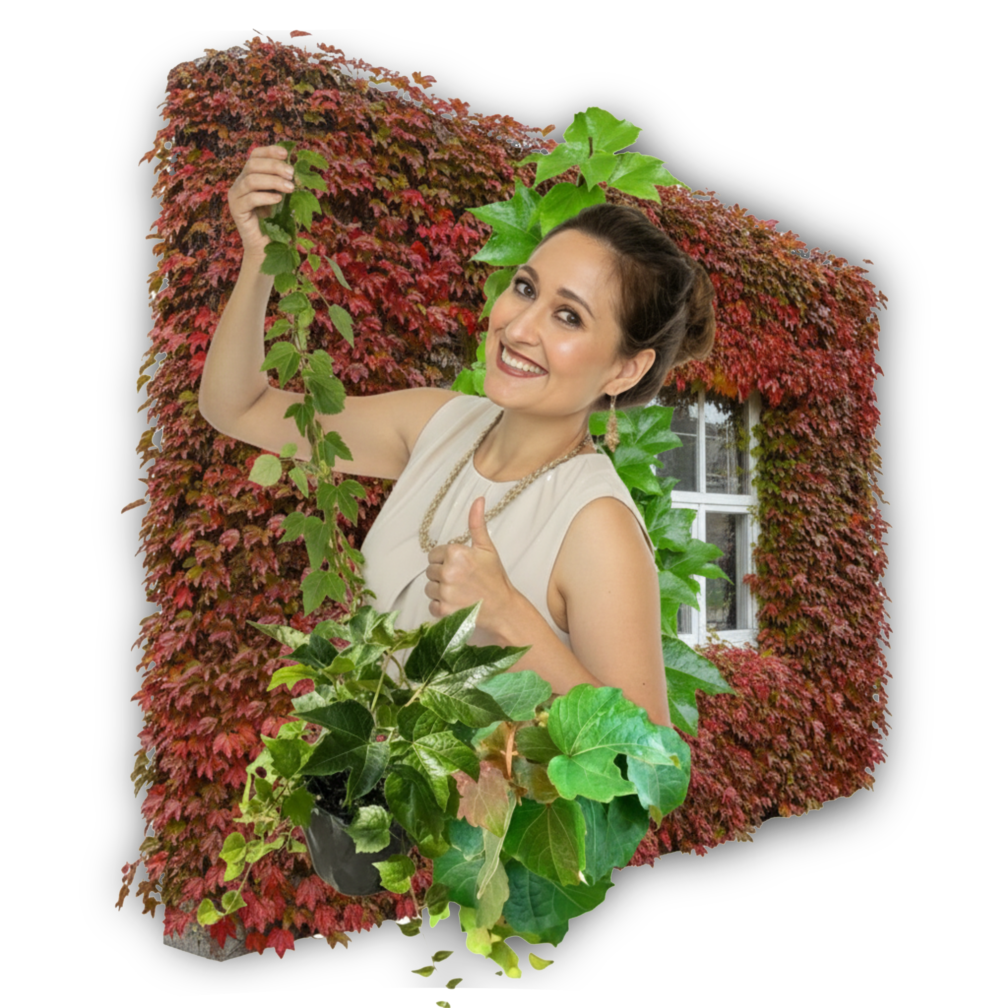 Лиана самостоятельно цепляется за любые поверхности с помощью воздушных корешков и буквально «приклеивается» к стенам — подвязка и опоры не требуются. Это идеальное решение для вертикального озеленения без лишних хлопот.