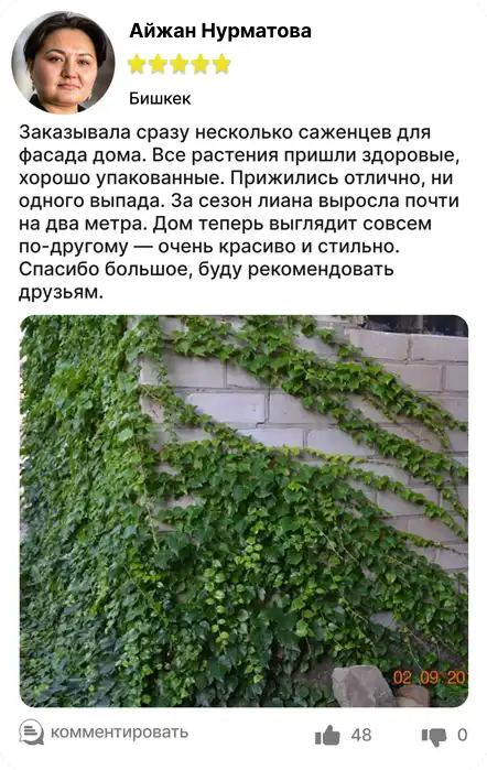 Компактная форма для аккуратного вертикального озеленения. Саженцы формируют плотный зелёный покров и отлично подходят для стен, ограждений и небольших конструкций.